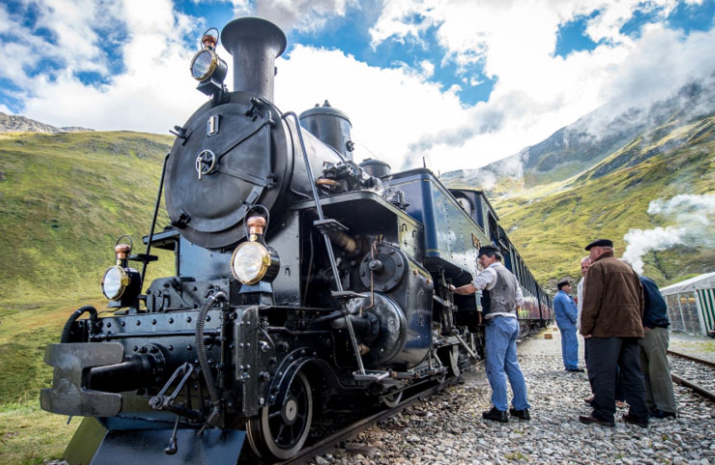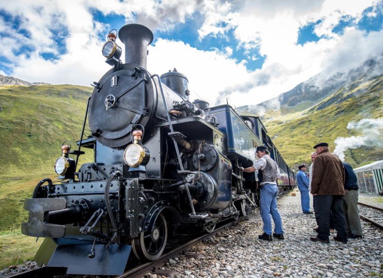 Steigen Sie ein in den historischen Dampfzug und endtecken Sie eine prachtvolle alpine Bergwelt. Im Talboden windet sich die junge Furka-Reuss, während der Dampfzug dank der Zahnstange stetig an Höhe gewinnt. Wilde Abgründe, von einer herrlichen Alpenflora gesäumt, sind zu überwinden, bis der Zug den Scheiteltunner an der Furka erreicht.